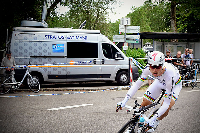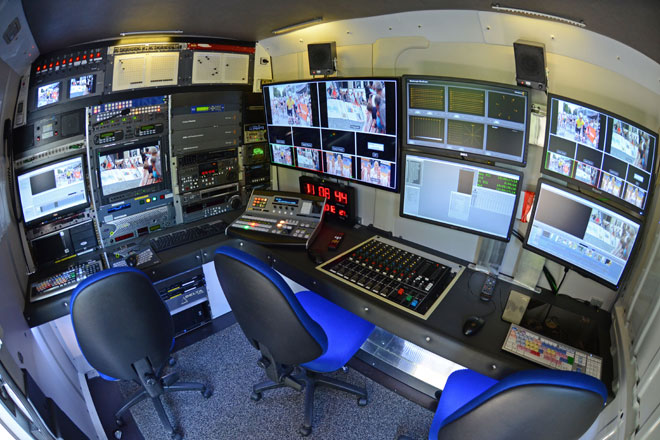 können wir mit diesem Fahrzeug von jedem Produktionsort in Europa senden und das auch in HD-Qualität. Im Innenraum des